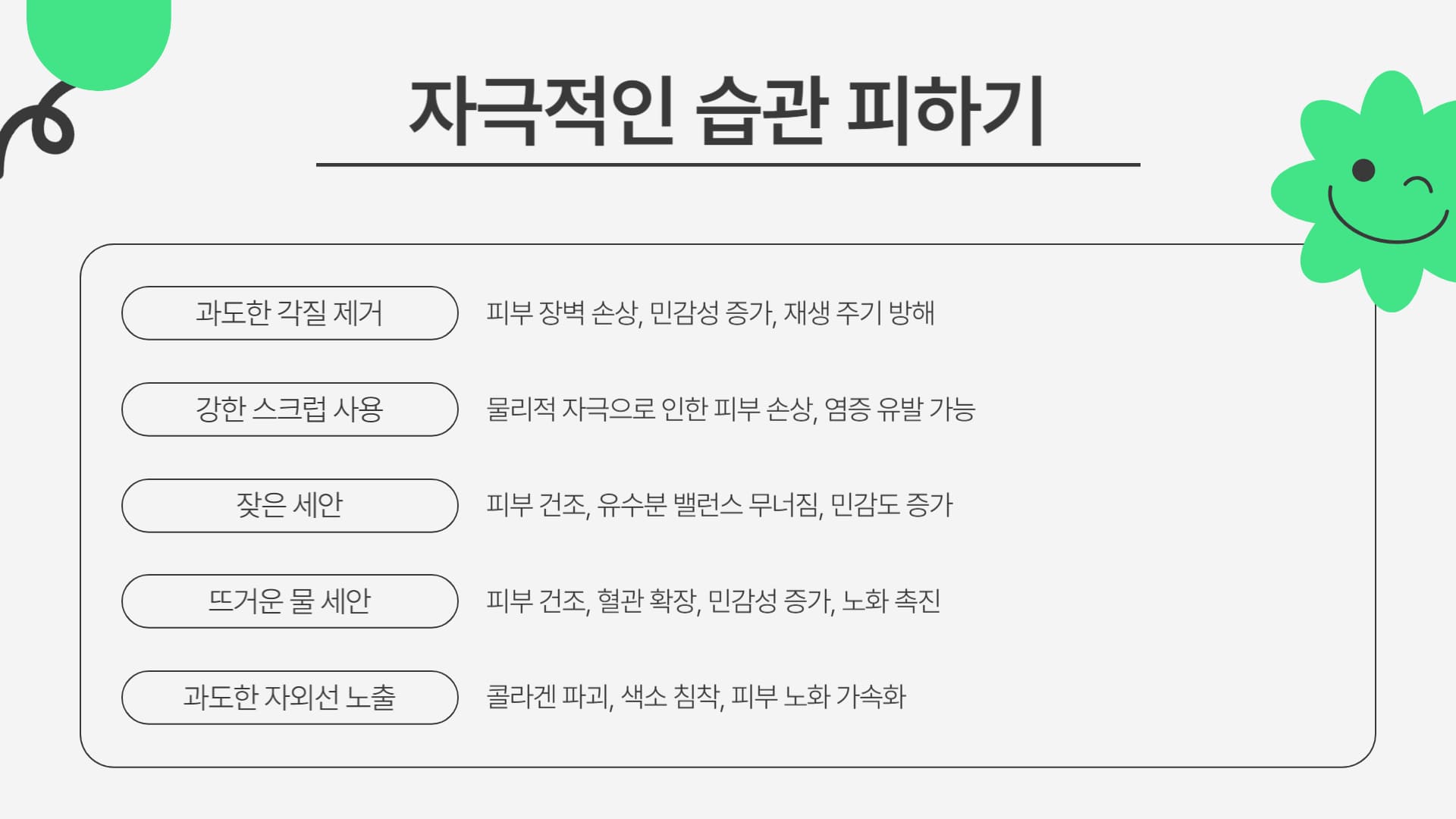 - 자극적인 습관 피하기: 때를 미는 습관, 강한 스크럽 사용, 잦은 세안 등 피부에 물리적 자극을 주는 행동은 피하는 것이 좋습니다.