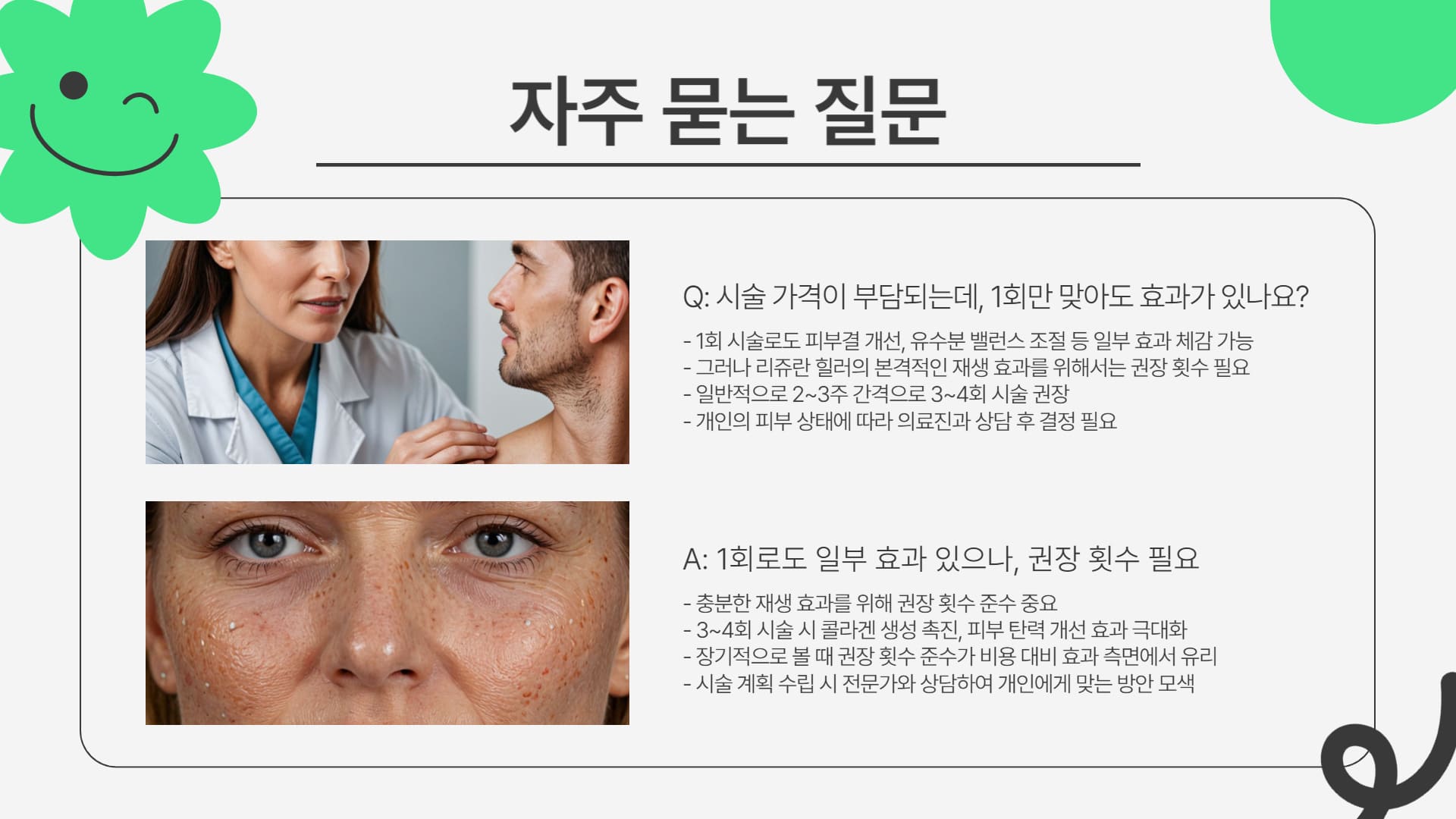 - Q2: 시술 가격이 부담되는데, 1회만 맞아도 효과가 있나요?