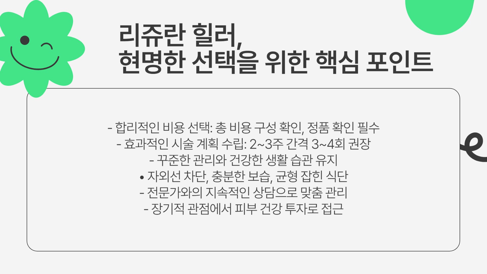 리쥬란 힐러 시술은 피부 건강을 위한 좋은 '투자'입니다. 이러한 생활 속 꾸준한 노력을 통해 시술 효과를 더욱 오래 유지하고 건강한 피부를 가꾸어 나가시길 바랍니다.