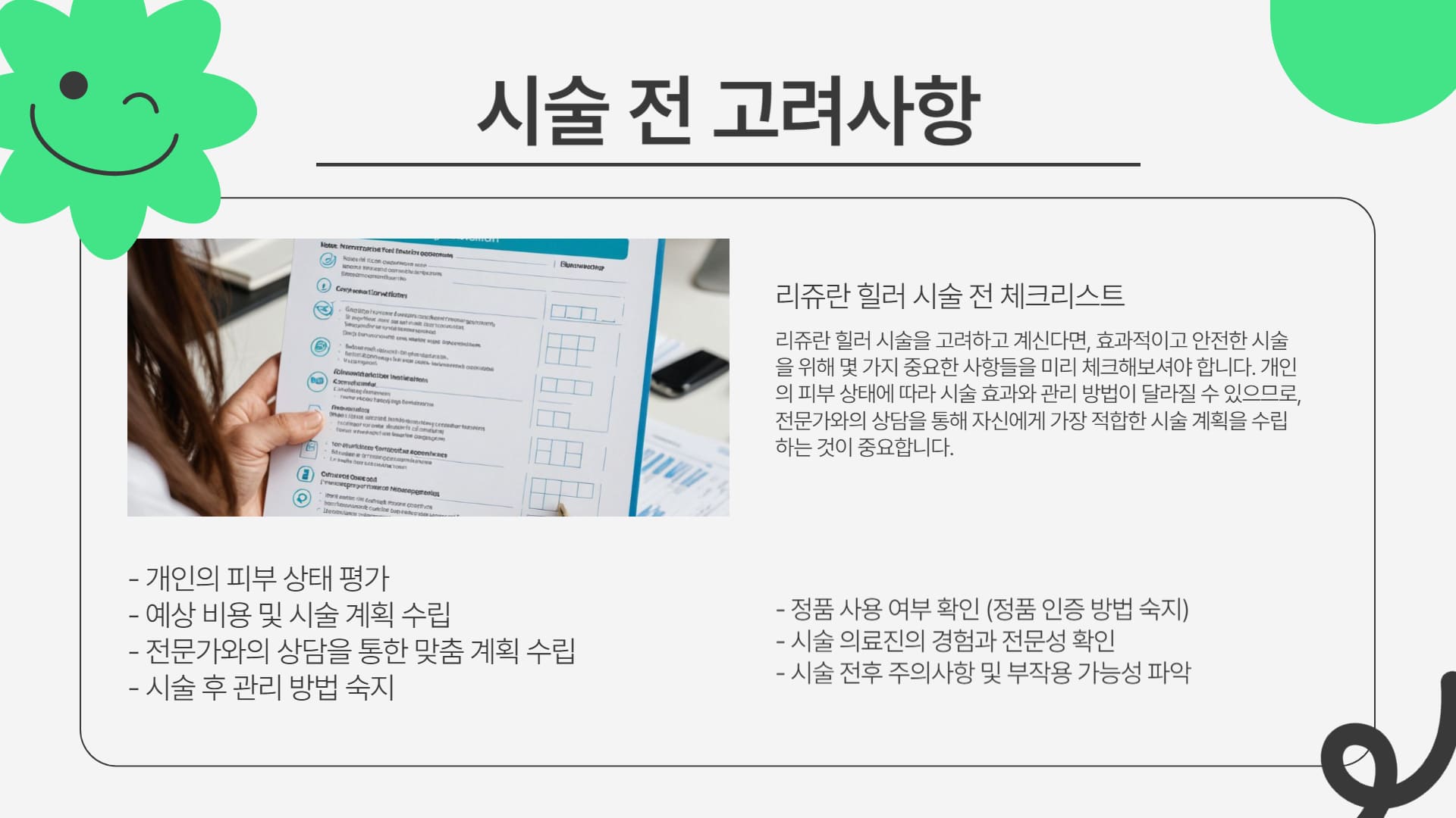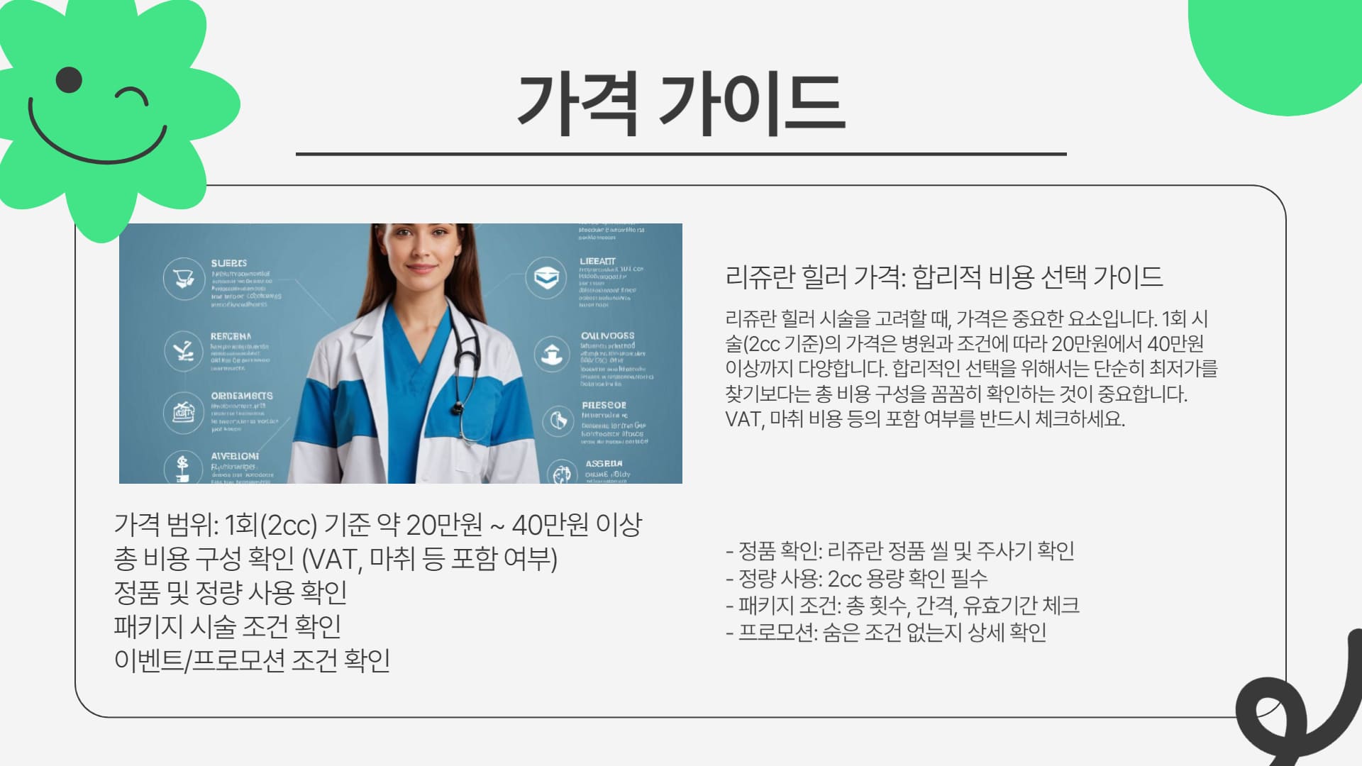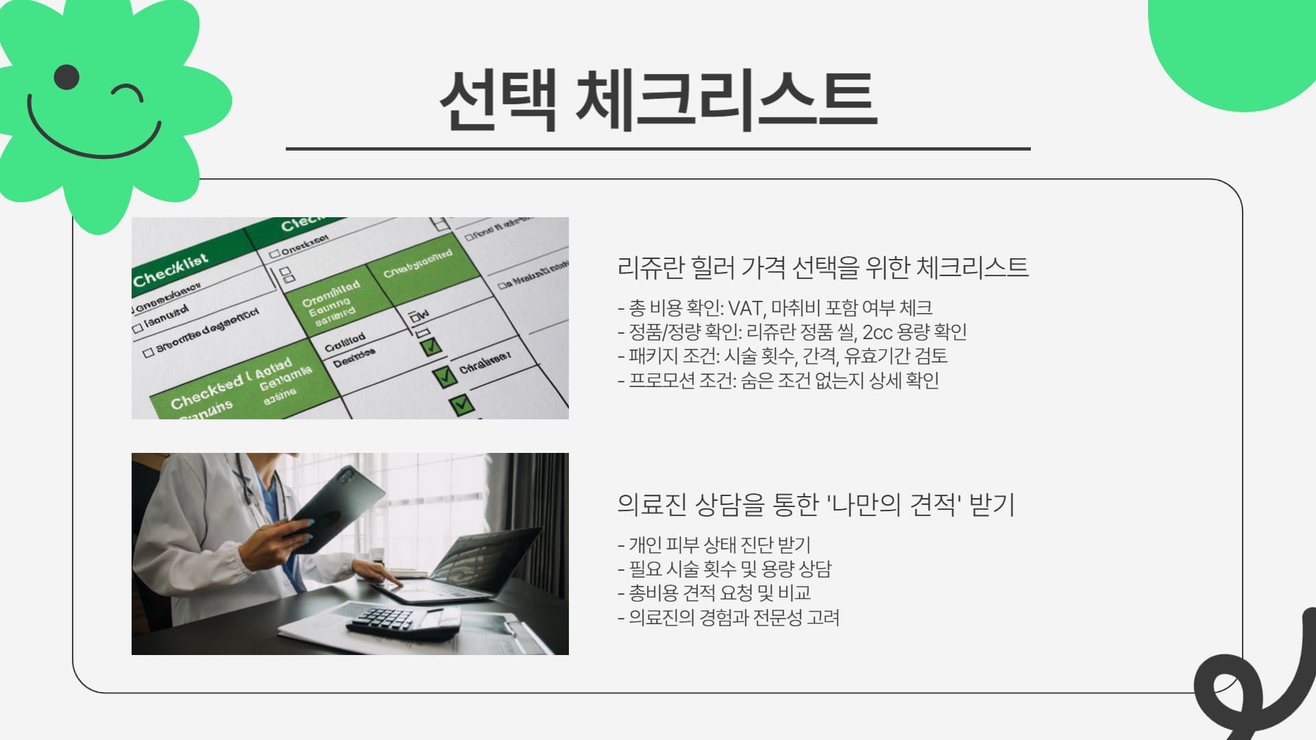 | 비용 | 총 비용 구성(VAT, 마취, 후관리 등), 정품/정량 확인, 패키지 조건(횟수, 기간), 의료진 상담 통한 맞춤 견적 비교. |