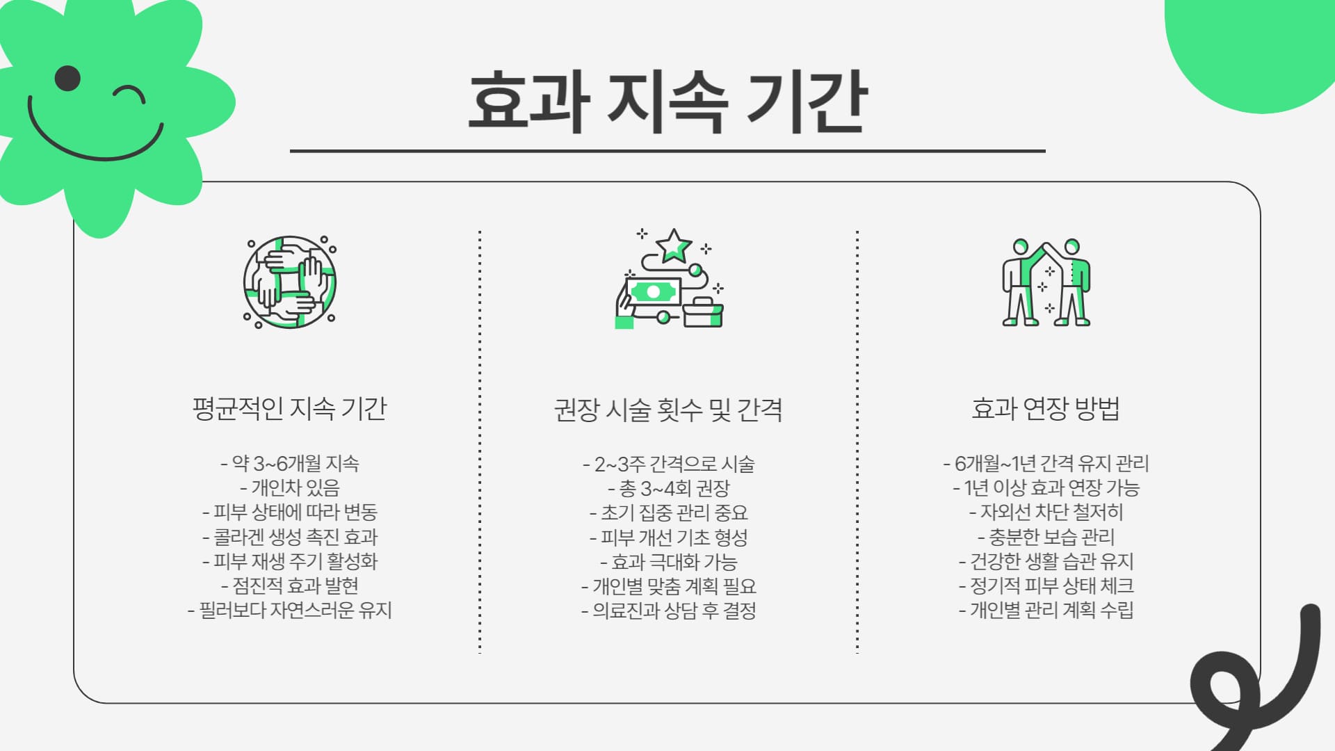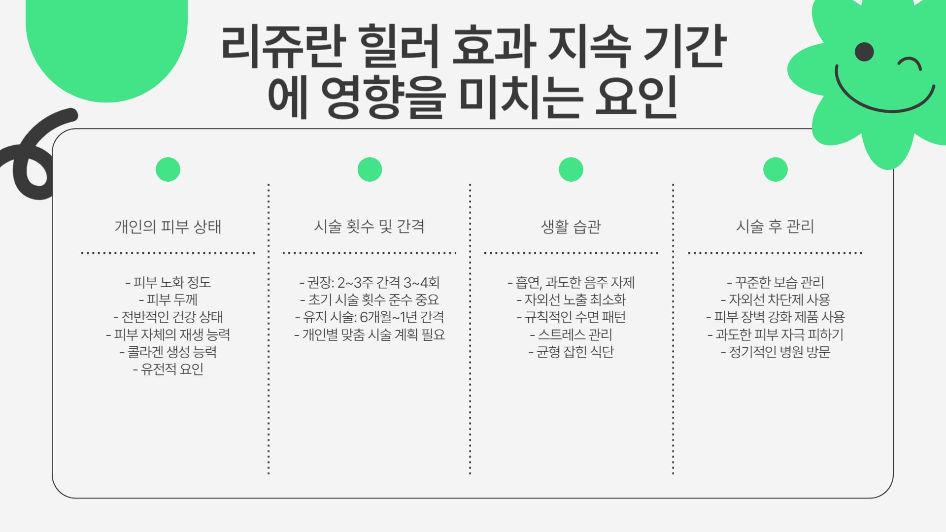 시술 효과의 유지 기간은 여러 요인에 따라 달라지므로, 평균적인 기간과 함께 영향을 미치는 요소들을 이해하는 것이 필요합니다.