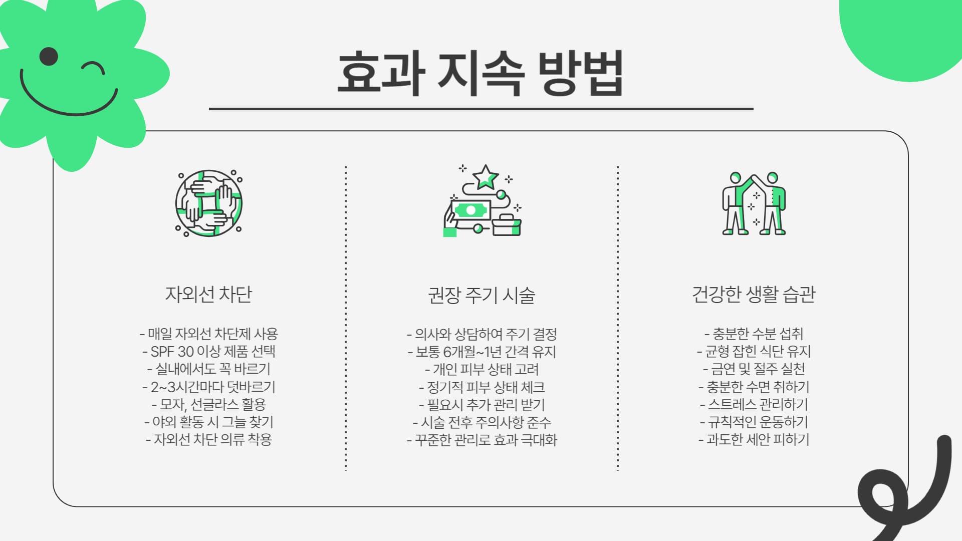 - A: 자외선 차단을 생활화하는 것이 가장 중요하며, 권장 주기에 맞춰 꾸준히 시술받고, 충분한 보습과 건강한 생활 습관을 유지하는 것이 도움이 됩니다.