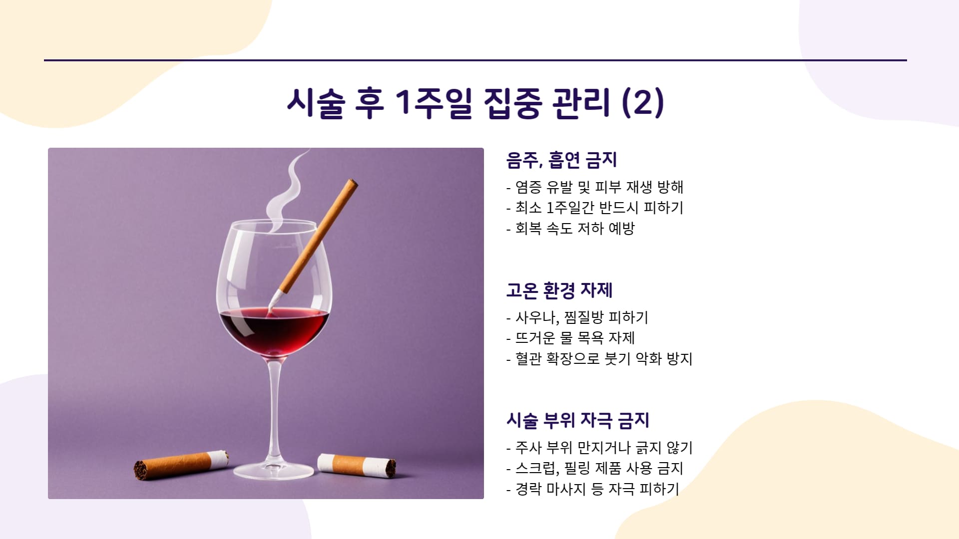 - 음주, 흡연 금지: 염증을 유발하고 피부 재생을 방해하므로 최소 1주일간은 반드시 피해야 합니다.