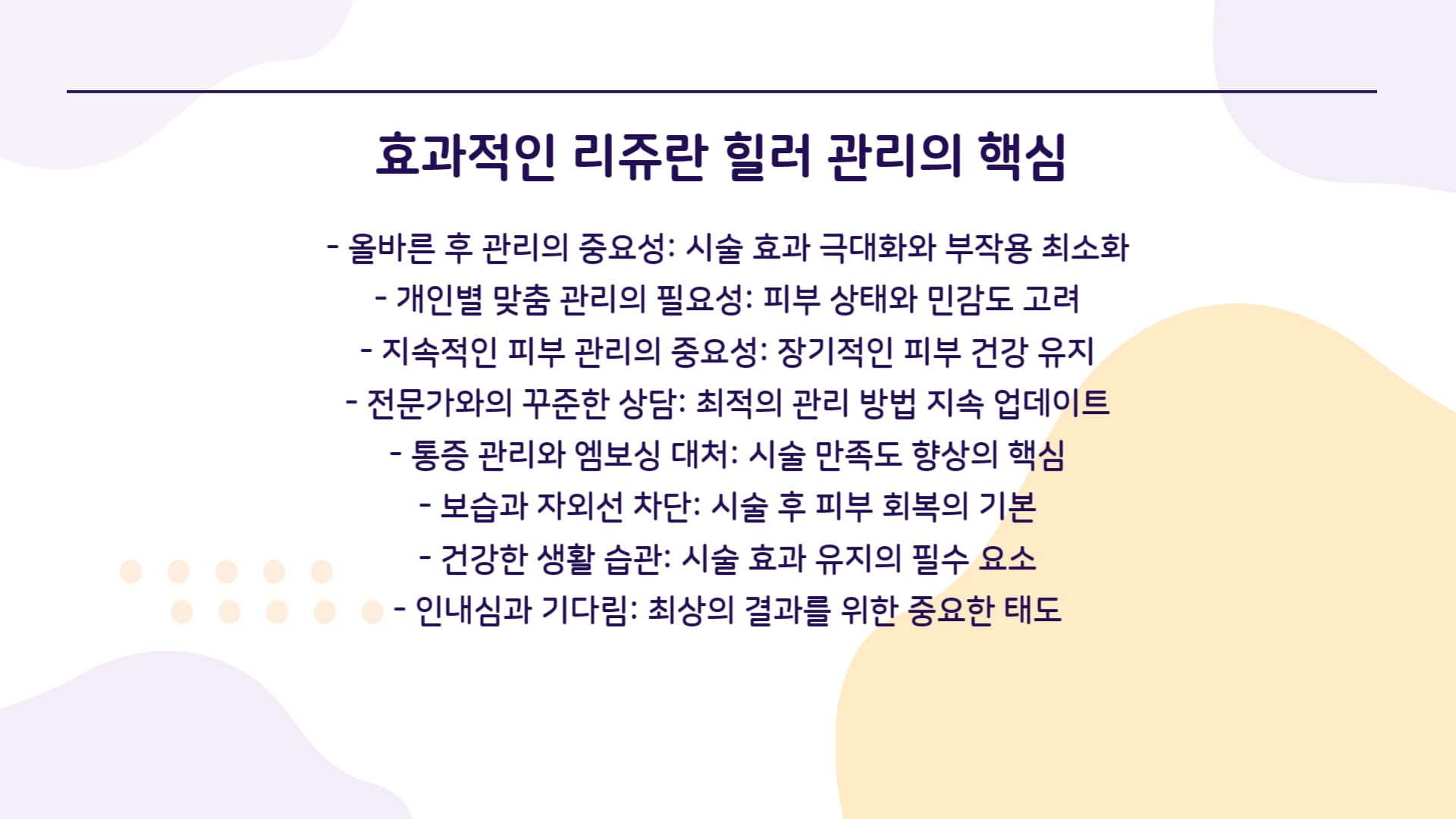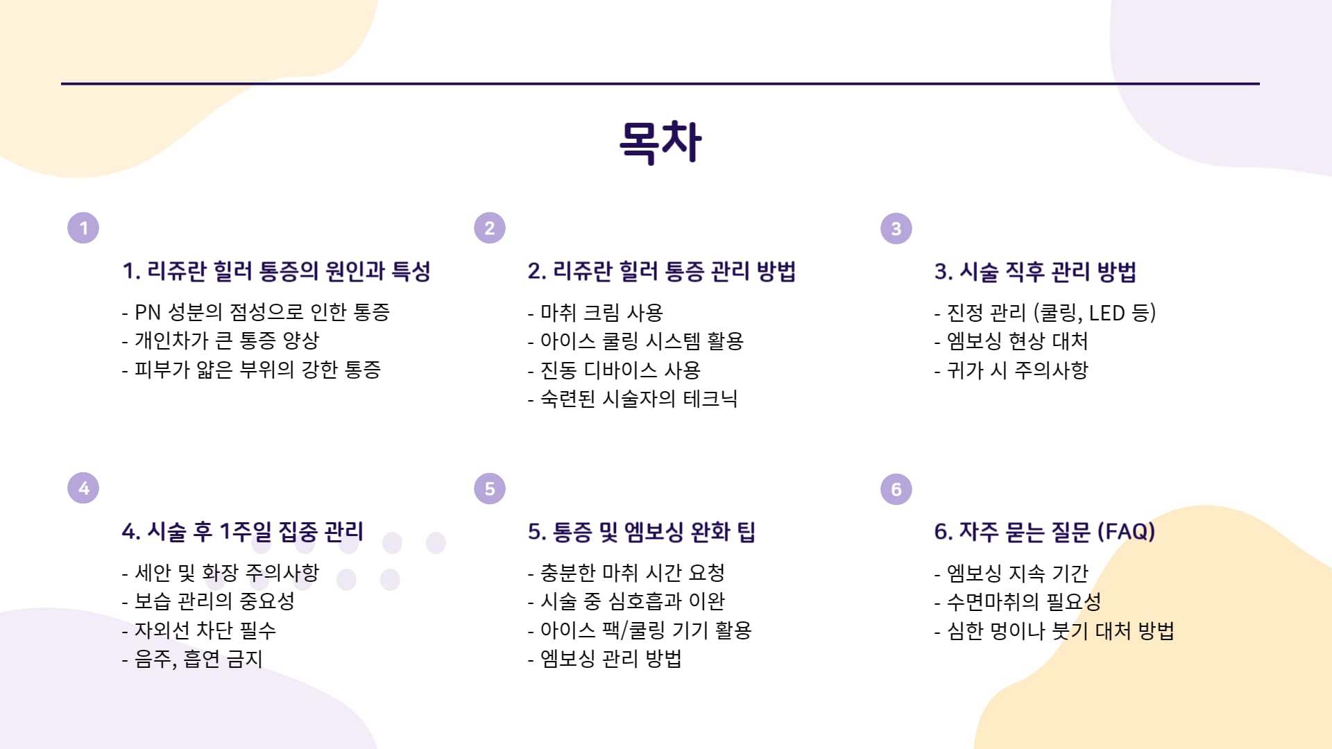 통증에 대한 막연한 두려움을 덜고, 꼼꼼한 후 관리로 건강하고 아름다운 피부를 가꾸시길 바랍니다.