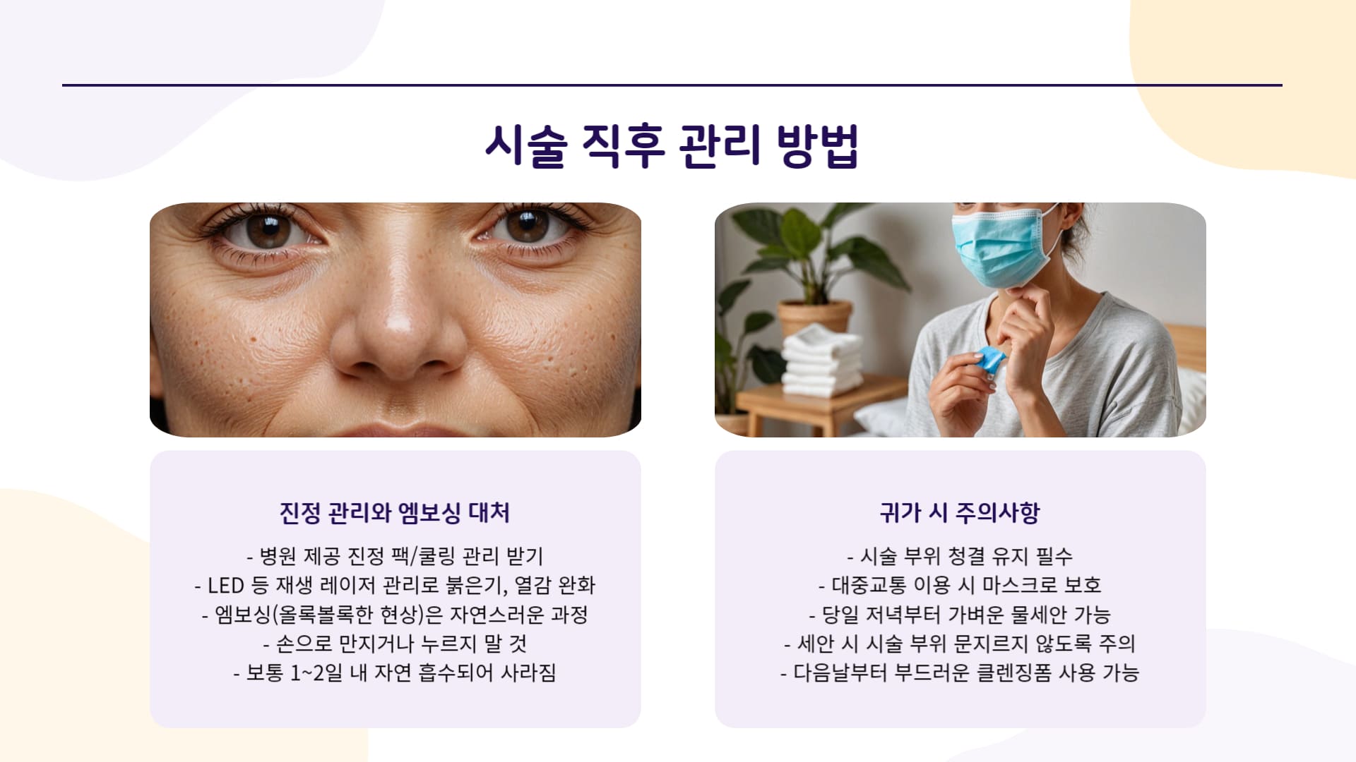 - 귀가 시 주의: 시술 부위를 청결하게 유지하고, 대중교통 이용 시 마스크 등으로 보호하는 것이 좋습니다.