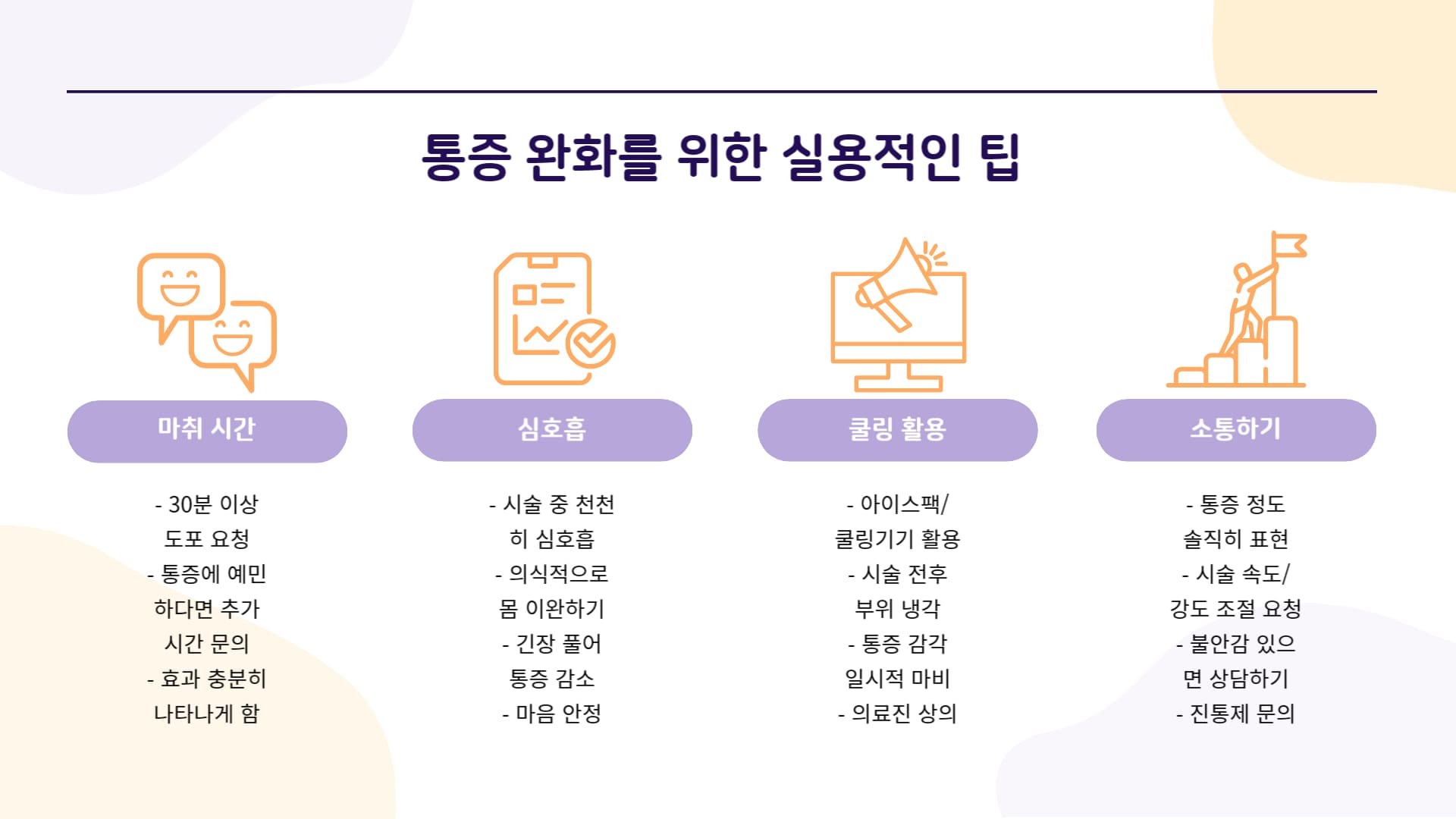 - 의료진에게 통증 정도 알리기: 아픈 것을 무조건 참는 것보다, 시술 중 통증이 심하게 느껴지면 의료진에게 즉시 표현하여 시술 속도나 강도를 조절할 수 있도록 소통하는 것이 중요합니다.