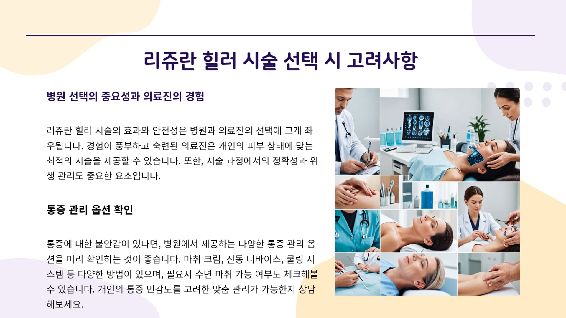 시술 전 상담 시 자신의 통증 민감도에 대해 솔직하게 이야기하고, 병원에서 제공하는 통증 관리 옵션에 대해 충분히 설명을 듣고 선택하는 것이 중요합니다.