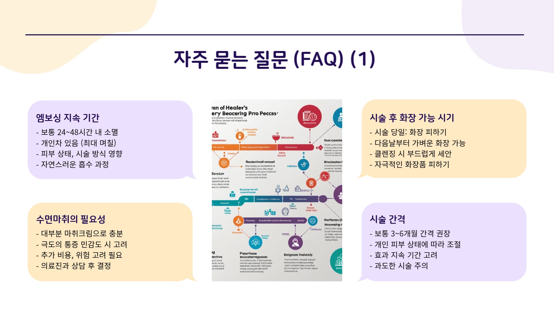 - 메이크업으로 커버: 엠보싱이 신경 쓰여 외출이 꺼려진다면, 시술 다음 날부터는 메이크업으로 가볍게 커버할 수 있습니다. (단, 클렌징 시 부드럽게!)