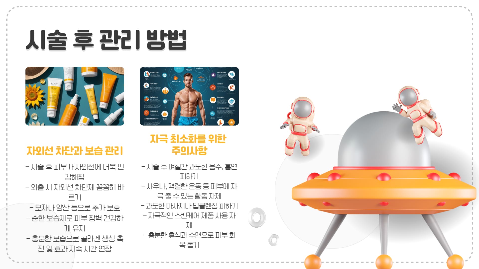 - 자극 최소화 : 시술 후 며칠간은 과도한 음주, 흡연, 사우나, 격렬한 운동 등 피부에 자극을 줄 수 있는 활동은 피하는 것이 좋습니다.
