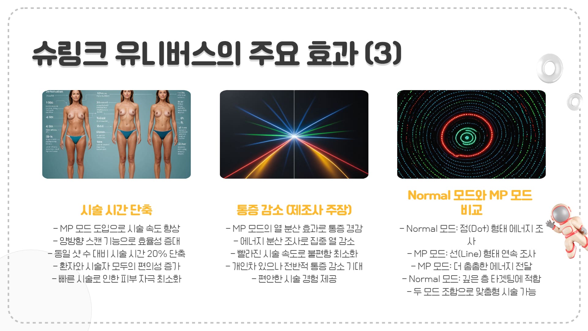 - 시술 시간 단축 및 통증 감소 (제조사 주장): 슈링크 유니버스는 에너지를 점(Dot) 형태로 조사하는 Normal 모드 외에도, 선(Line) 형태로 촘촘하고 빠르게 에너지를 전달하는 MP 모드(Micro Pulsed)를 탑재했습니다. 이를 통해 동일 샷 수 대비 시술 시간을 단축하고, 에너지가 분산되어 조사되므로 시술 시 느껴지는 통증을 줄이는 데 도움을 줄 수 있다고 알려져 있습니다. (통증은 개인차가 있습니다.)