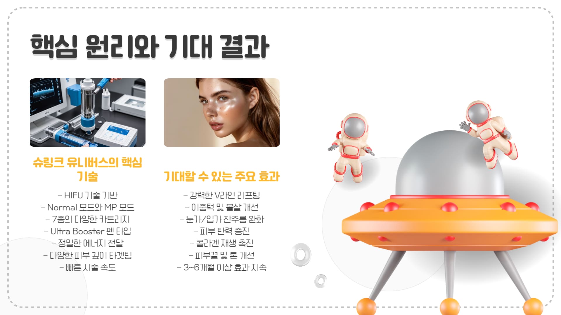 슈링크 유니버스는 기존 슈링크의 HIFU 기술을 바탕으로 하되, 업그레이드된 기능들을 통해 효과와 편의성을 한층 높였습니다. 핵심은 더욱 정교하고 다양한 맞춤 시술이 가능하다는 점입니다.