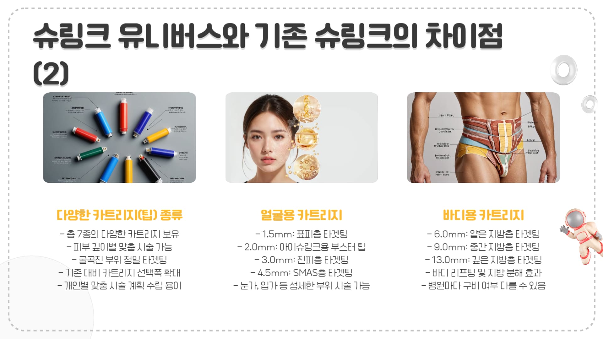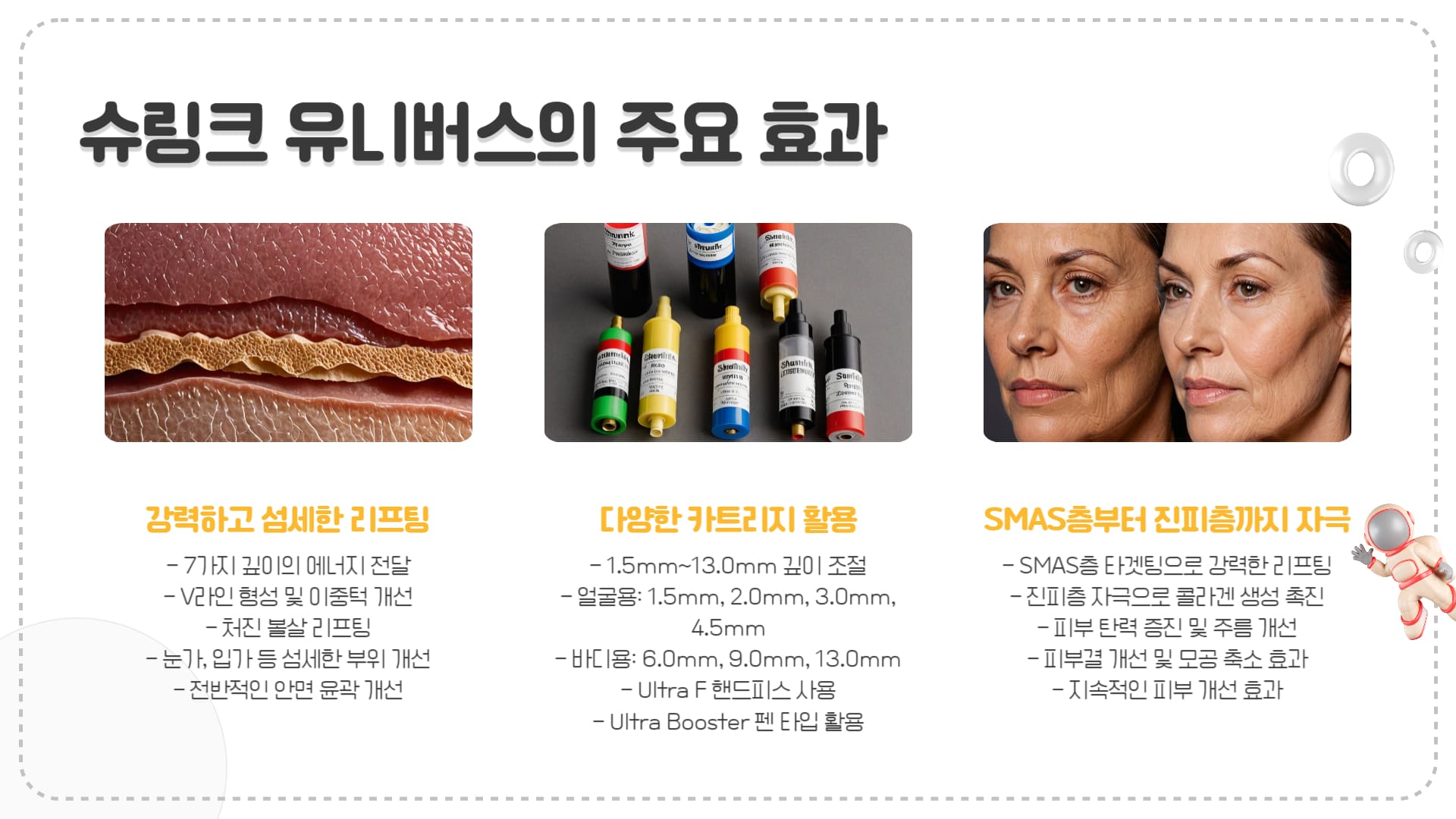 - 슈링크 유니버스: 총 7가지 종류의 다양한 카트리지를 보유하고 있습니다. (얼굴용: 1.5mm, 2.0mm(부스터), 3.0mm, 4.5mm / 바디용: 6.0mm, 9.0mm, 13.0mm - 바디팁은 병원마다 구비 여부 다름) 특히 2.0mm 깊이의 부스터 카트리지(아이 슈링크용 팁 등)와 울트라 부스터 펜 타입 핸드피스는 기존에 접근이 어려웠던 눈가, 입가, 팔자주름 등 굴곡지고 세밀한 부위에 더욱 정교하고 효과적인 시술을 가능하게 합니다.