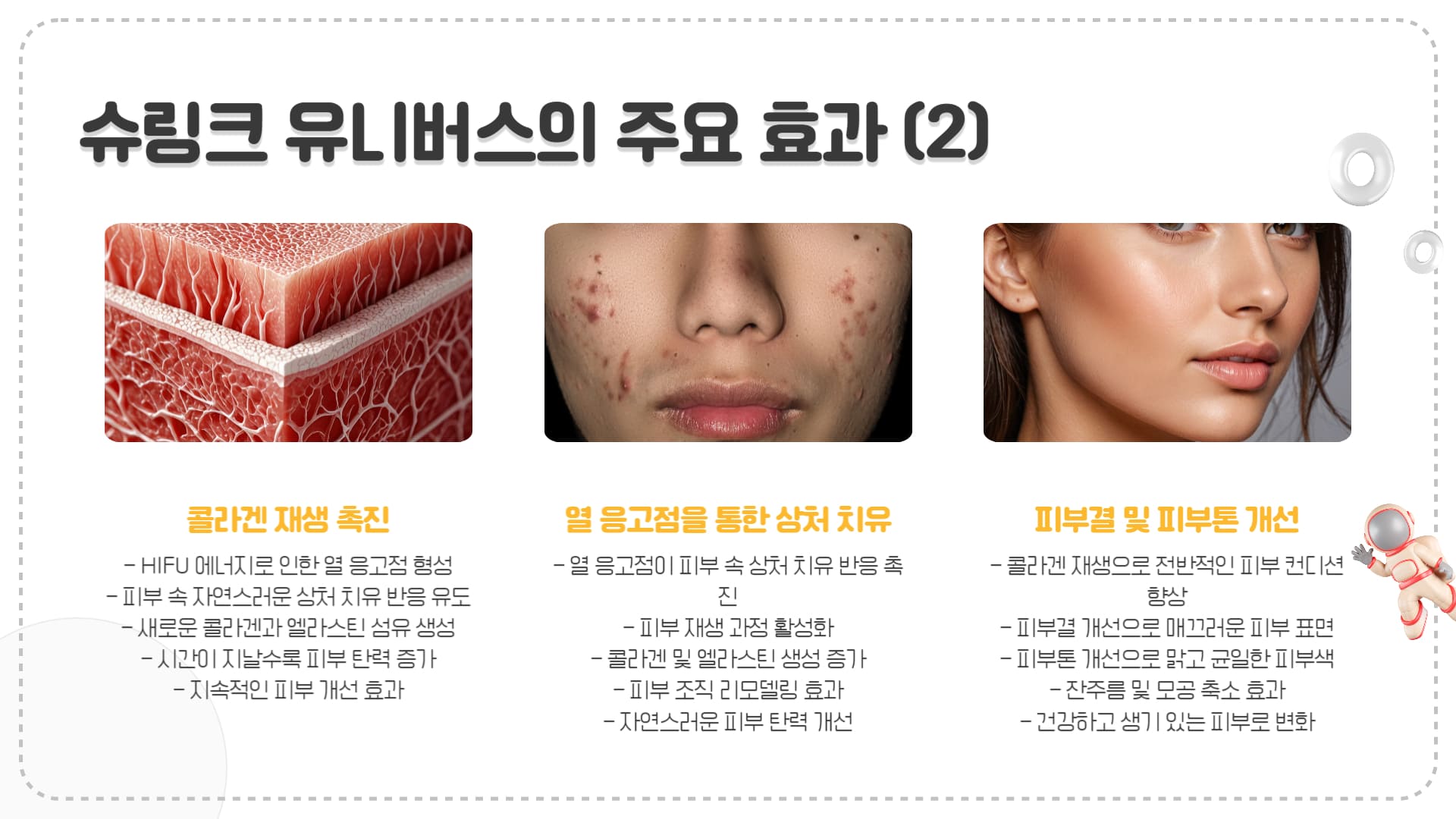 결국 슈링크 유니버스 효과는 기존 슈링크의 장점을 바탕으로 더욱 다양한 피부층과 부위에 맞춤형 시술을 제공함으로써, 더 만족스러운 리프팅 및 피부 개선 결과를 이끌어내는 데 초점을 맞추고 있습니다.
