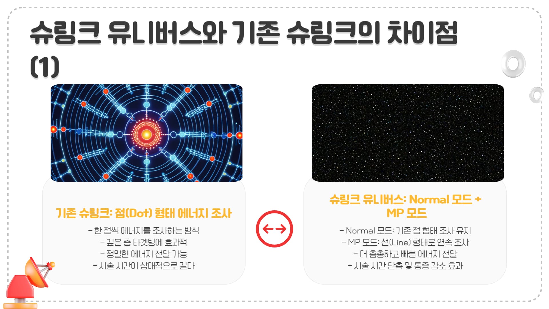 - 기존 슈링크: 주로 점(Dot) 형태로 에너지를 한 점씩 찍듯이 조사했습니다.