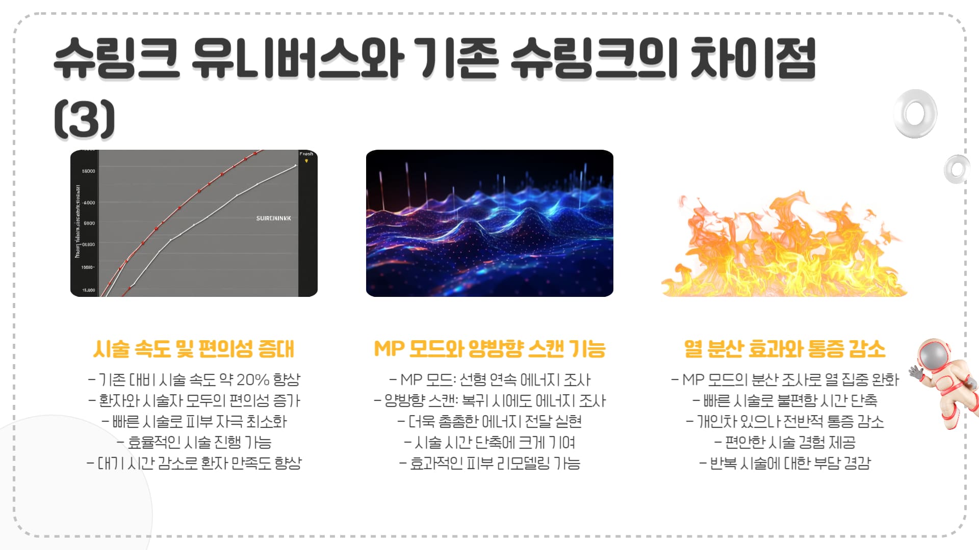 - MP 모드와 양방향 스캔 기능(에너지 조사 후 복귀 시에도 조사) 등을 통해 기존 슈링크보다 시술 속도가 빨라졌다는 평가입니다. 이는 환자와 시술자 모두의 편의성을 높이는 요소입니다.