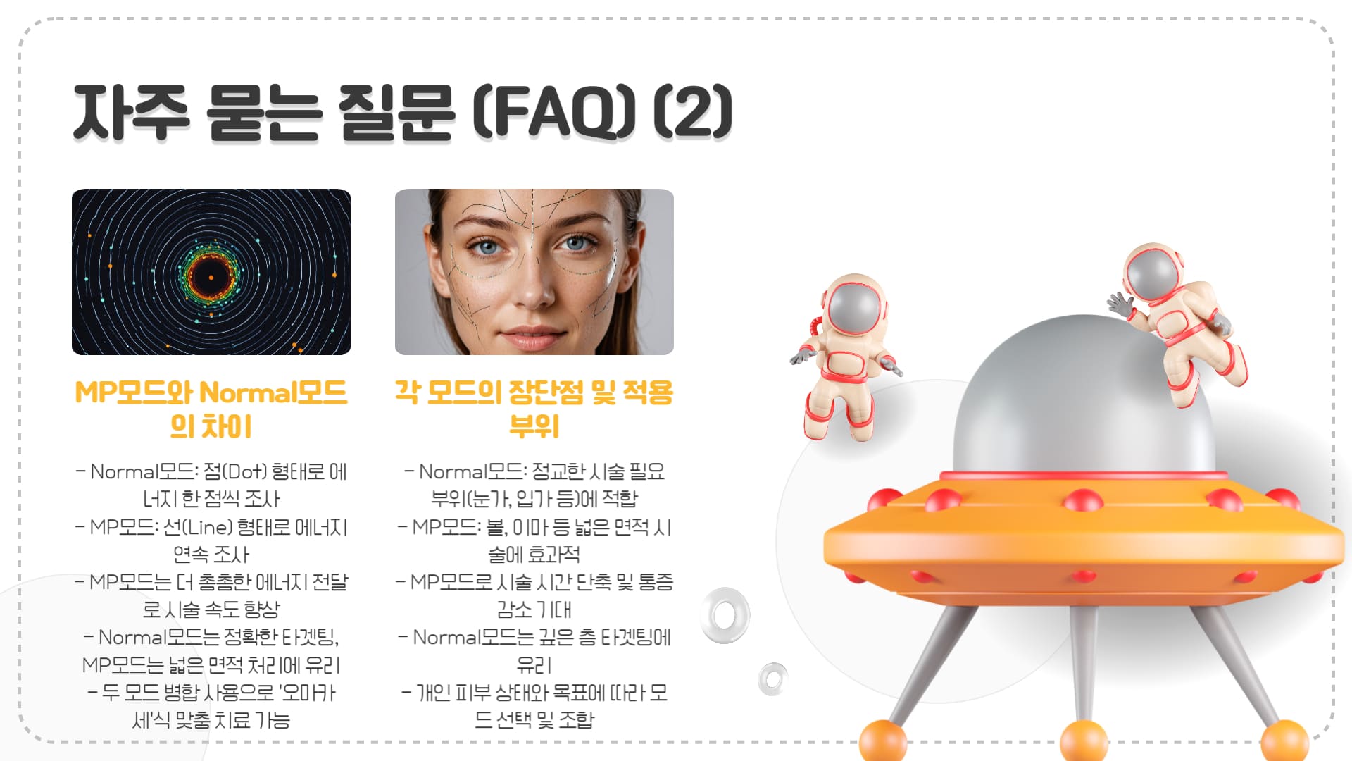 - A: Normal모드는 기존 슈링크처럼 에너지를 점(Dot) 형태로 한 점씩 조사하는 방식입니다. MP모드(Micro Pulsed)는 에너지를 선(Line) 형태로 피부에 매우 빠르게 연속적으로 조사하여 열을 더 촘촘하게 전달하는 방식입니다. MP모드는 시술 속도를 높이고 통증을 줄이는 데 도움을 줄 수 있으며, 피부 표면 가까운 층에 적용하여 타이트닝 효과를 높이는 데 사용되기도 합니다.