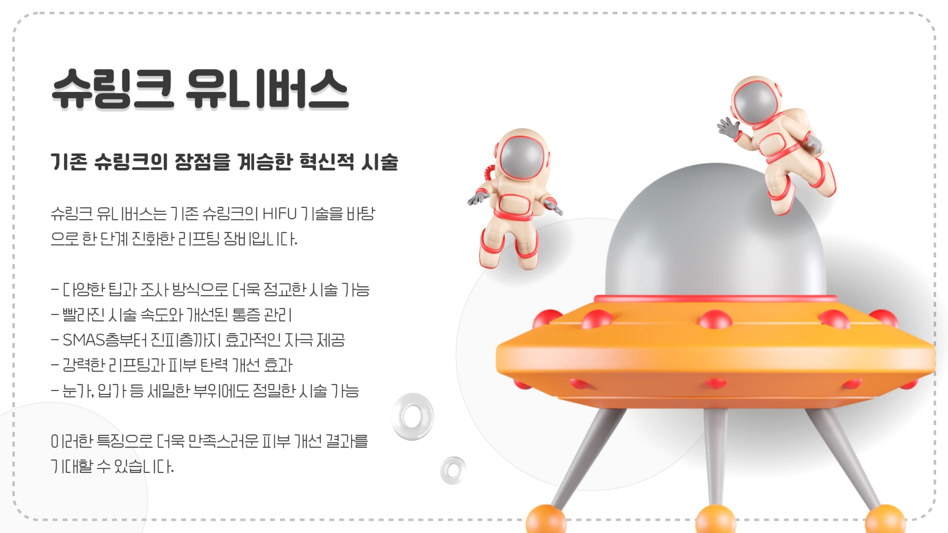 슈링크 유니버스는 기존 슈링크에서 한 단계 진화한 HIFU(고강도 집속 초음파) 리프팅 장비로, 더욱 정교하고 다양한 방식으로 피부 개선 효과를 제공합니다.