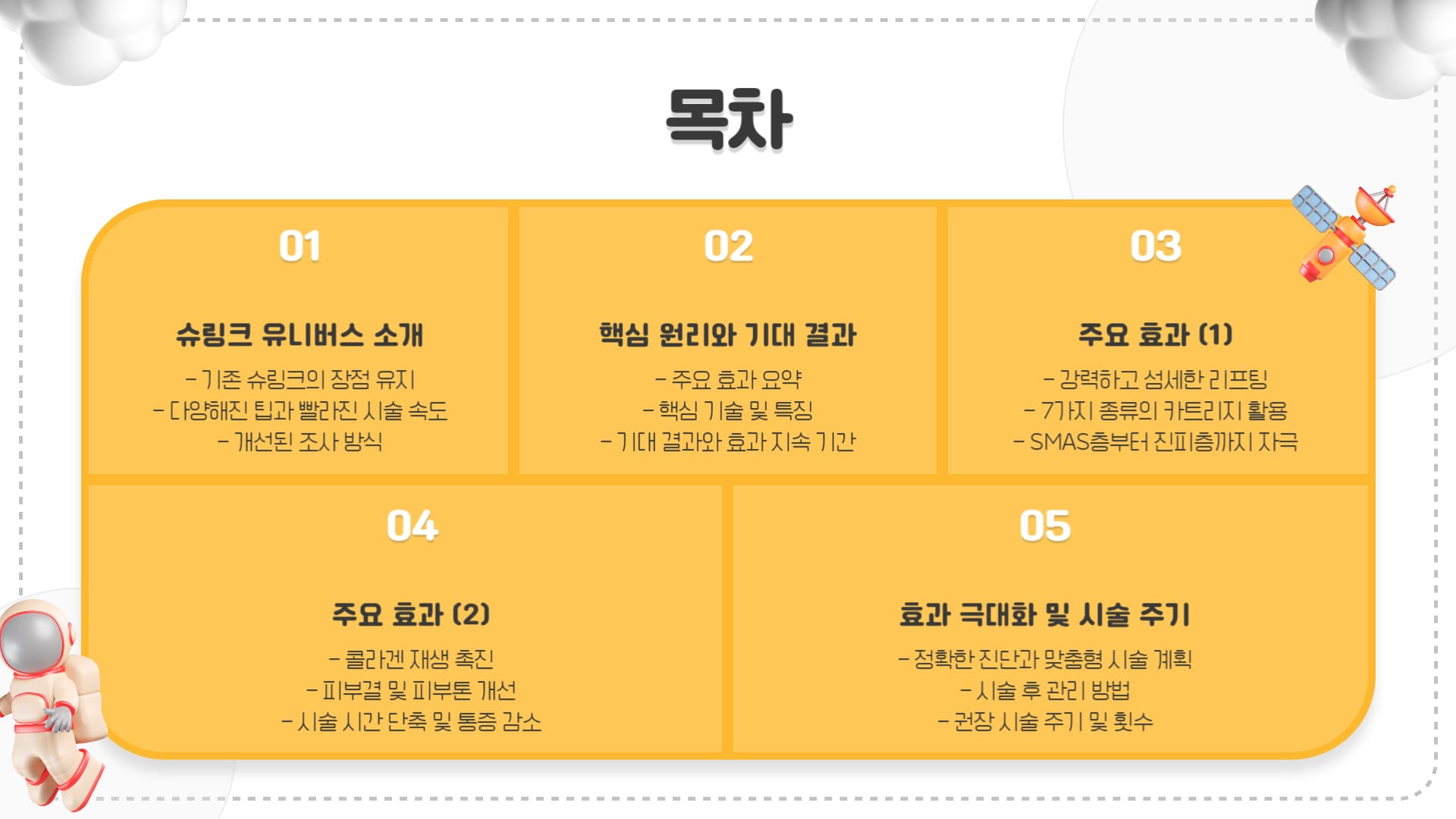 주요 효과 | 기존 슈링크 효과 (피부 리프팅, 탄력 증진, 콜라겐 재생) 강화 + 더욱 정교하고 꼼꼼한 시술 가능, 굴곡지고 세밀한 부위 맞춤 개선 (눈가, 입가 등), 시술 시간 단축 및 통증 감소 기대. |