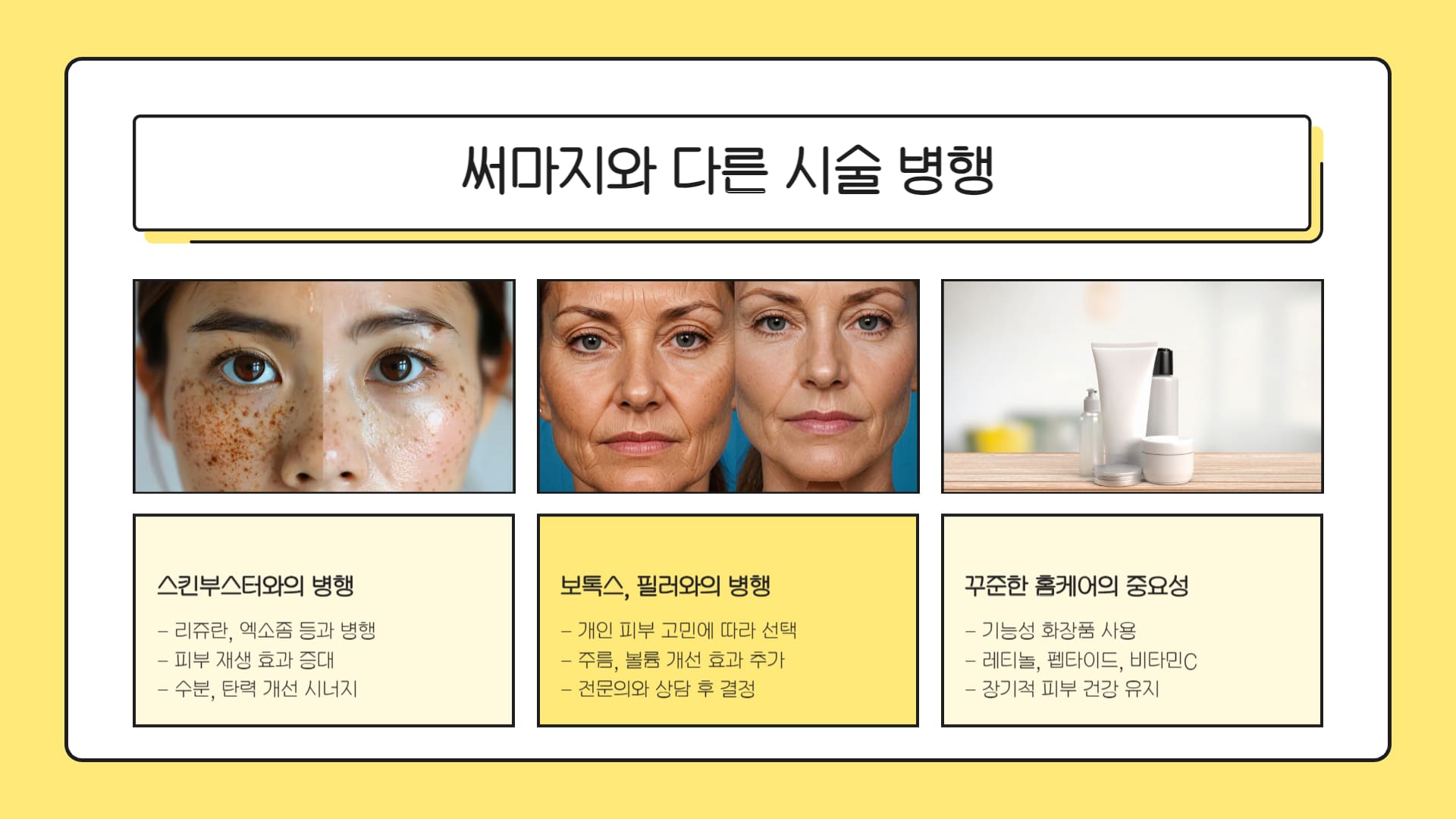 • 다른 시술과의 병행 (전문가와 상담 필수): 개인의 피부 고민에 따라 써마지 시술 후 스킨부스터(리쥬란 힐러, 엑소좀 등), 보톡스, 필러, 또는 다른 리프팅 레이저(울쎄라 등 '울써마지') 등을 적절히 병행하면 써마지 효과를 더욱 증대시키거나 보완할 수 있습니다. 하지만 모든 시술이 병행 가능한 것은 아니며, 반드시 경험 많은 의료진과 충분한 상담을 통해 개인에게 맞는 최적의 조합과 시기를 결정해야 합니다.