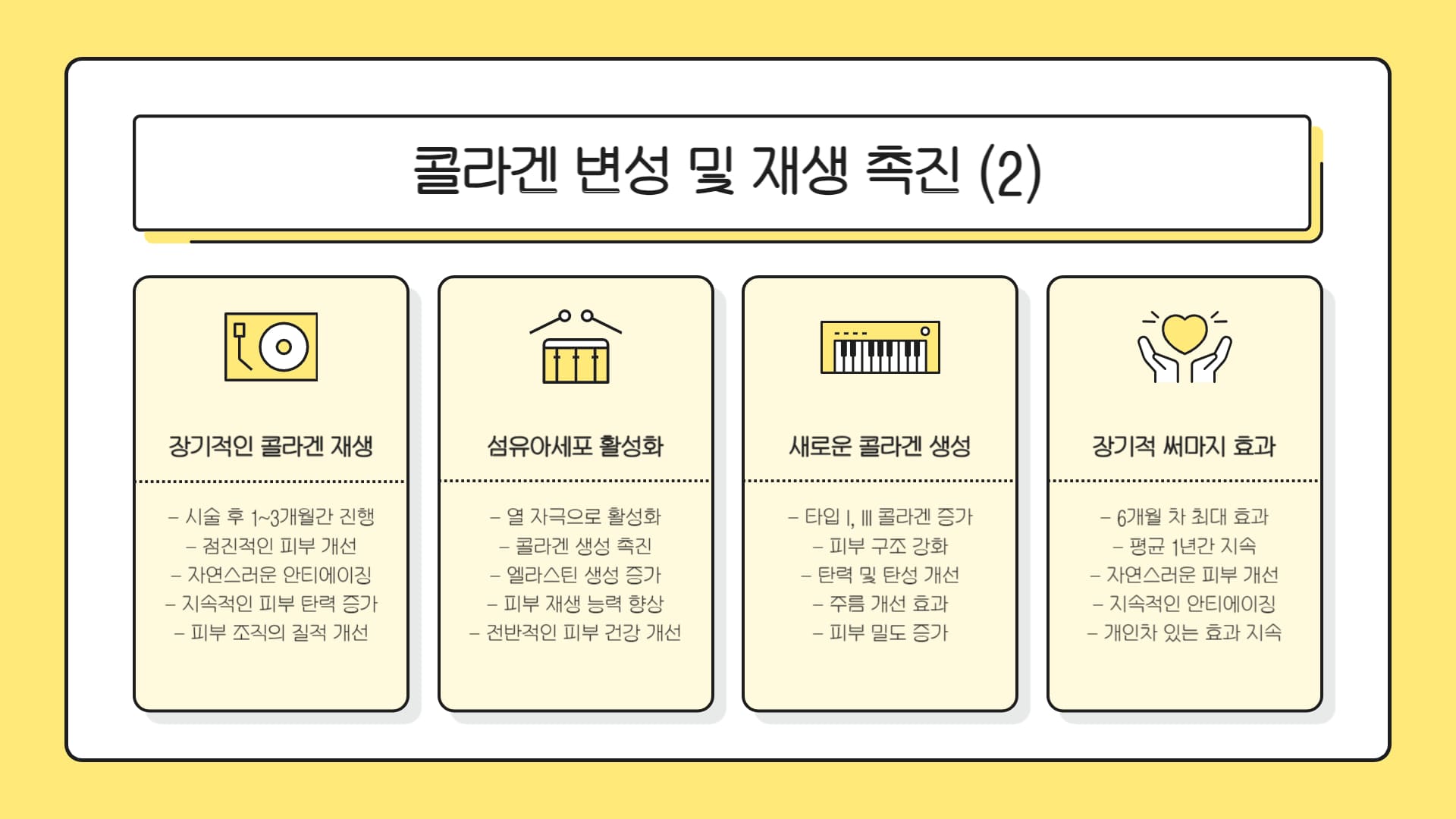 피부 탄력 증진  피부 전체의 쫀쫀함과 탱탱함 개선, 시간이 지날수록 피부가 차오르는 느낌, 처진 피부 일부 개선. 콜라겐 리모델링 및 신생 콜라겐 생성 촉진 결과.