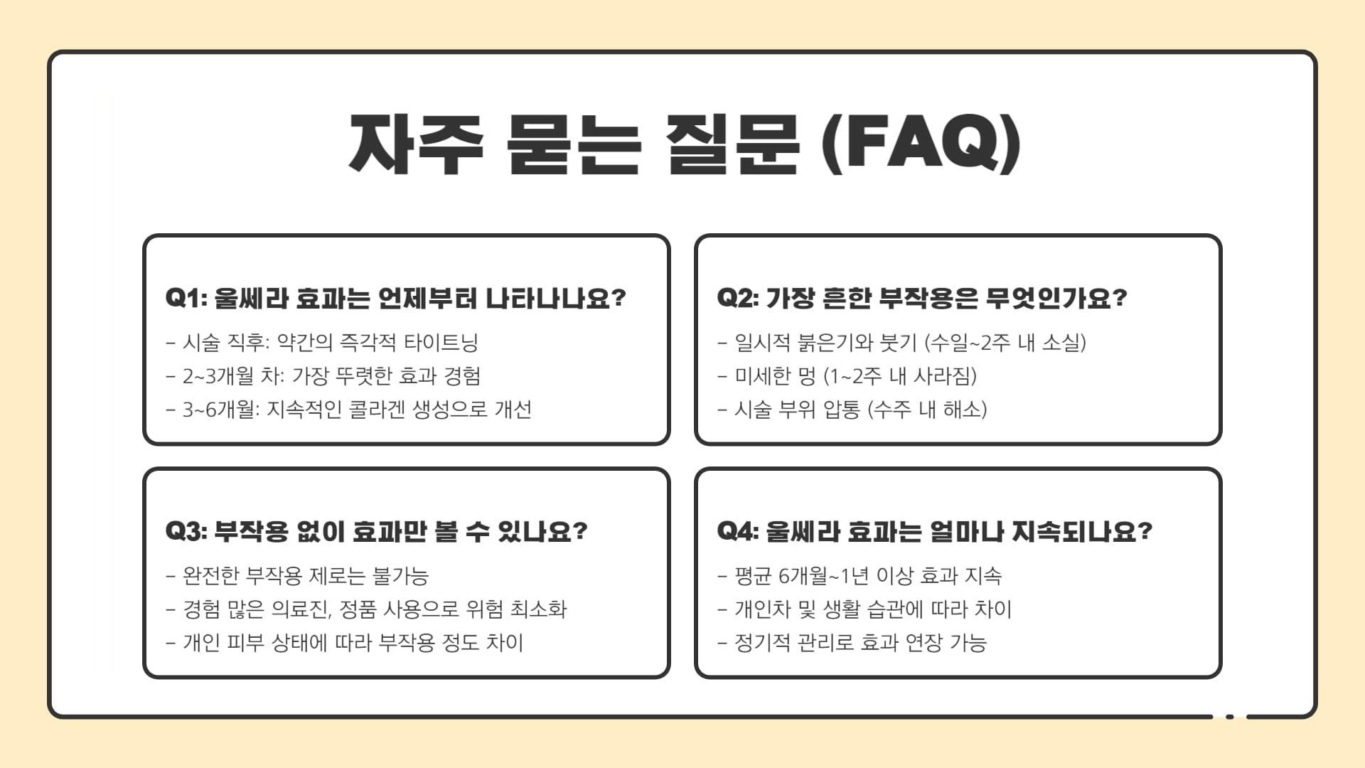 - Q2: 울쎄라 부작용 중 가장 흔한 것은 무엇이고 얼마나 지속되나요?