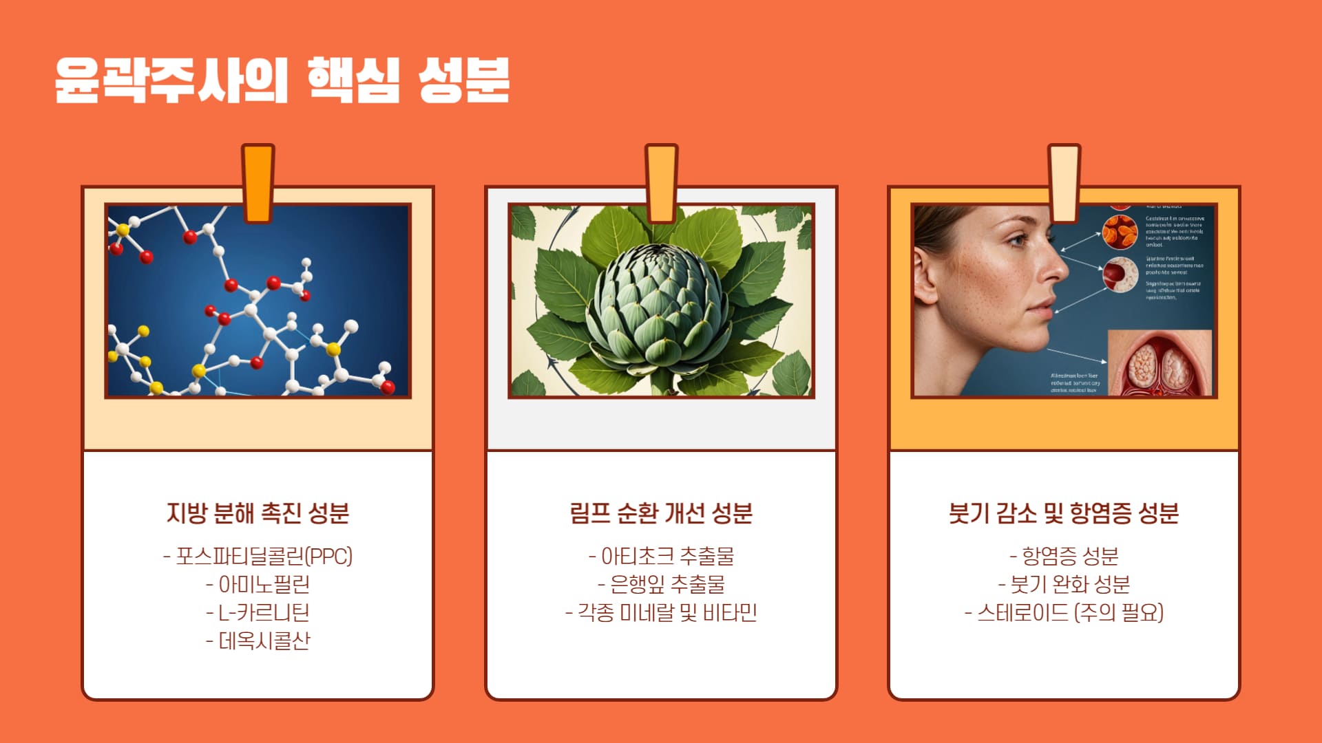 윤곽주사가 어떻게 얼굴 라인을 개선하는 효과를 내는지 이해하기 위해서는 그 안에 담긴 핵심 성분들과 작용 원리를 아는 것이 중요합니다. 윤곽주사 효과의 비밀은 바로 이 성분들의 복합적인 작용에 있습니다. (단, 윤곽주사의 성분 배합은 병원마다 고유의 노하우로 조합하는 경우가 많아 모든 병원이 동일하지는 않습니다.)