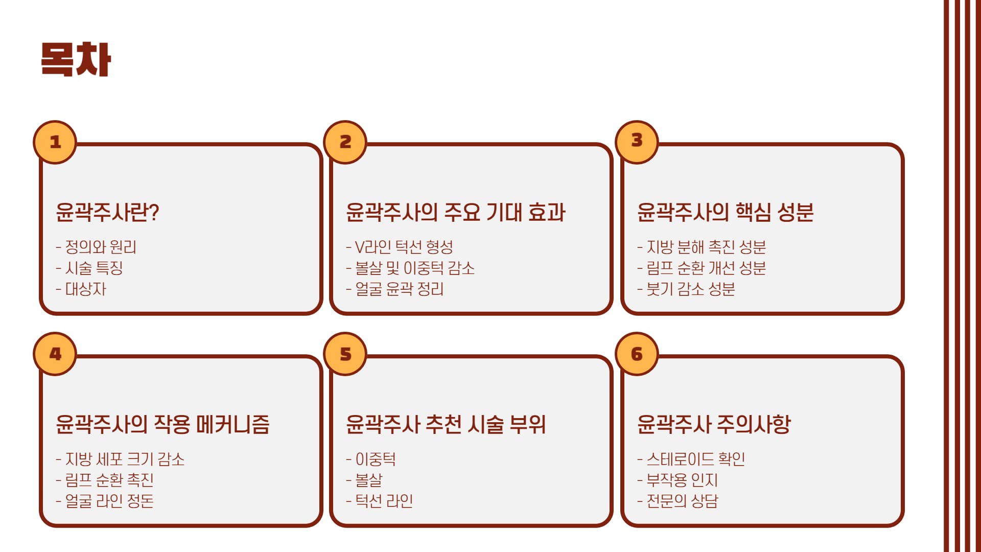 윤곽주사는 비교적 간단한 주사 시술로 얼굴의 불필요한 지방을 줄이고 라인을 정돈하여 갸름한 얼굴형을 만드는 데 도움을 줍니다. 많은 분들이 궁금해하는 윤곽주사 효과의 핵심적인 내용과 특징을 먼저 표로 요약해 보았습니다.
